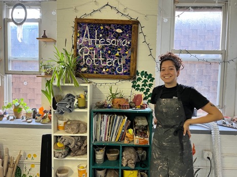 Union City, NJ – Talia Boado poses in front of a sign that reads “Artesana Pottery” on Thursday, April 6, 2023. Artesana Pottery is a pottery studio in Hudson County run by Ana Gonzalez where those interested can sign up for classes. (Photo Credit/Nicole Boado)