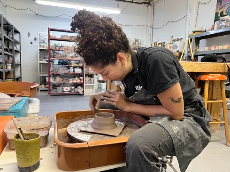 Union City, NJ – Talia Boado throws clay on the pottery wheel on Thursday, April 6, 2023. (Photo Credit/Nicole Boado)